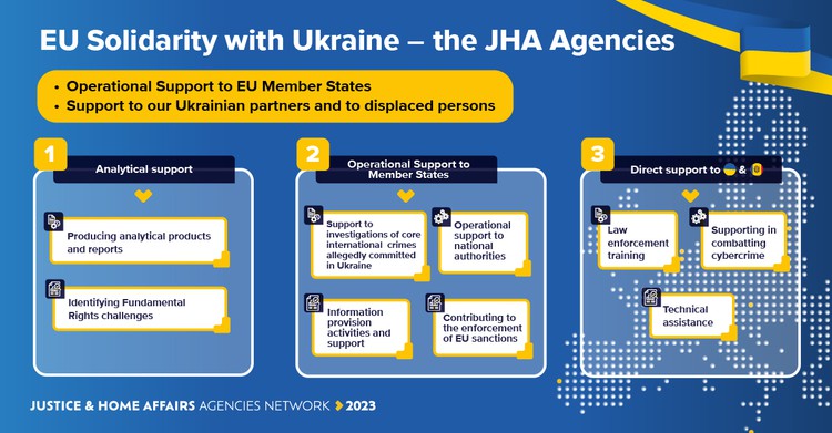 Russia’s unprovoked and unjustified military aggression against Ukraine, which started on 24 February 2022, triggered a firm and overarching political response by the European Union. Actions in the justice and home affairs policy field form integral parts of a successful and efficient response. The nine EU Agencies cooperating within the Justice and Home Affairs Agencies’ Network (JHAAN) play a vital role in this process by contributing to the implementation of political decisions made at the European level, assisting Member States and other countries, and providing support to people affected by the war, in particular persons displaced from Ukraine.