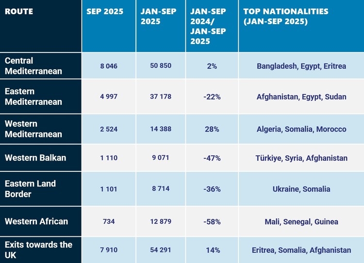 In the Central Mediterranean, nearly 50 900 arrivals were detected between January and September 2025, which is broadly in line with the same period last year. However, Libya, the main departure point, recorded a 50% increase in departures compared with 2024.