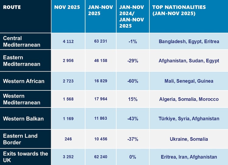 Irregular entries into the European Union dropped by 25% in the first eleven months of 2025 to just over 166 900, according to preliminary data from Frontex, the European Border and Coast Guard Agency.*