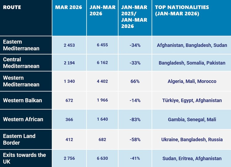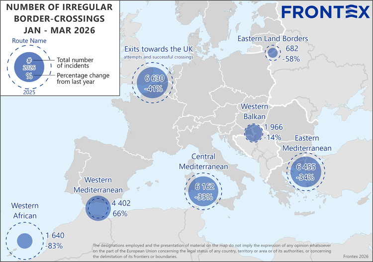 Poor weather across the main migratory routes into the European Union was among the key factors behind a continued sharp drop in irregular border crossings. In the first three months of 2026, detections fell by 39% compared with the same period last year, with just over 21 400 crossings recorded, according to preliminary data collected by Frontex.