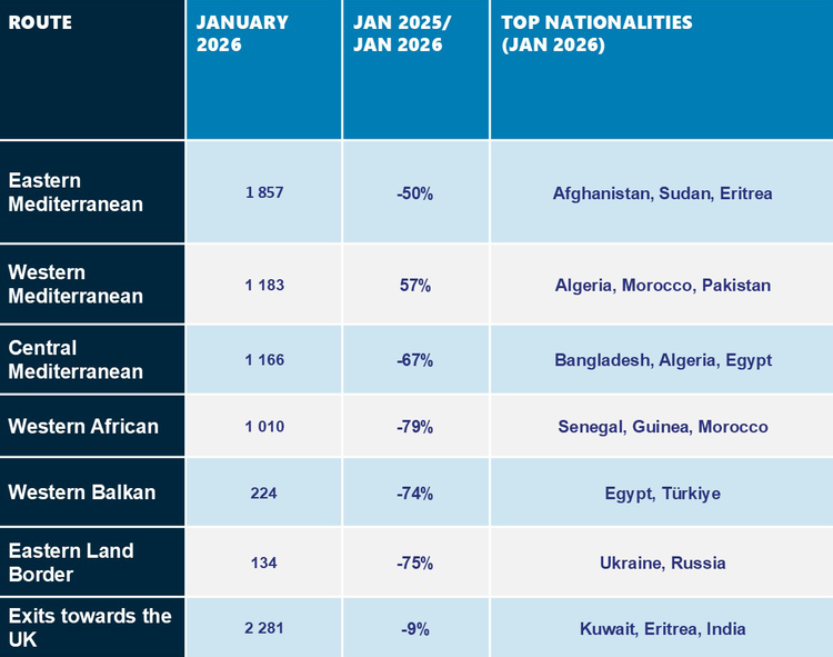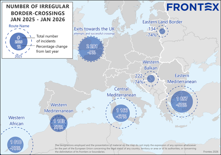 Severe winter storms and rough seas across key migratory routes contributed to a sharp 60% year-on-year drop in irregular border crossings into the European Union in January 2026, with around 5 500 detections recorded, preliminary data collected by Frontex showed.