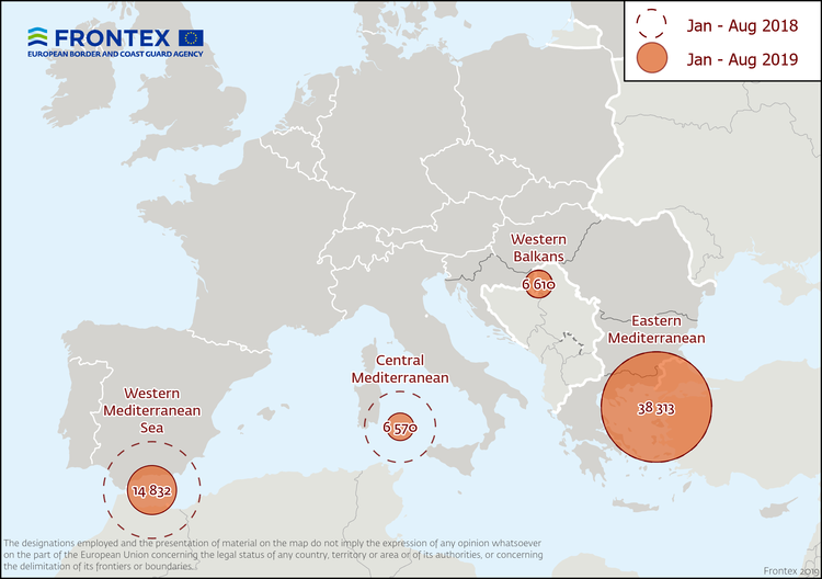 There were nearly 9 300 detections in August 2019* on the Eastern Mediterranean route accounting for nearly three-quarters of the total number of irregular migrants reaching Europe. This was double the figure from the same month of last year due to a large number of boats reaching the Greek islands in eastern Aegean, especially Lesbos, in late August.